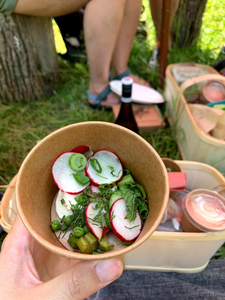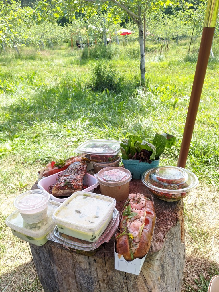 Une fois la réservation de votre boîte confirmée (80$ pour 2 personnes, que vous ne payez qu’une fois sur place), vous avez du jeudi au dimanche dans la semaine de votre réservation pour en profiter. Ensuite, il suffit de choisir votre place préférée parmi les tables de pique-nique, les buches en bois, votre propre couverture carrelée (ou non!), les chaises Adirondack, ou les divans extérieurs dans leur vaste verger. La vaisselle est majoritairement compostable et écoresponsable, et le panier de bois doit leur être retourné à la fin de l’expérience.