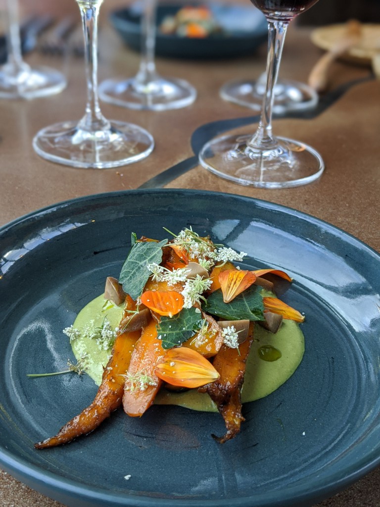 Farm to table, littéralement – Voici tous les ingrédients du menu qui sont cultivés sur les terres de Pearl Morissette: le fenouil, l’aubergine, le Pseudognaphalium obtusifolium, les carottes, le thym, les fèves, le chou-rave, le navet, le chou carafe, les courges, la laitue-asperge, et le foin d’odeur (sweet grass).
