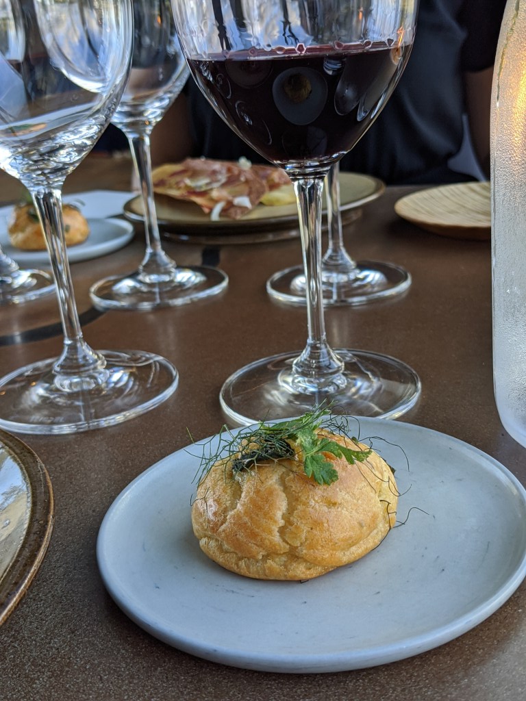 - Gougère d’aubergine : une gougère salée au Pseudognaphalium obtusifolium (rabbit tobacco), farcie de purée d’aubergine rôtie