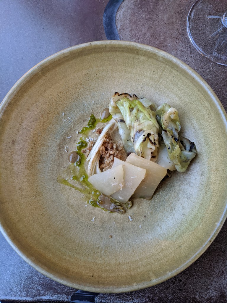 - Chou-fleur rôti : variété de Brassicas : Chou-rave, navet et chou carafe, accompagné d’une vinaigrette au miso de Red Fife