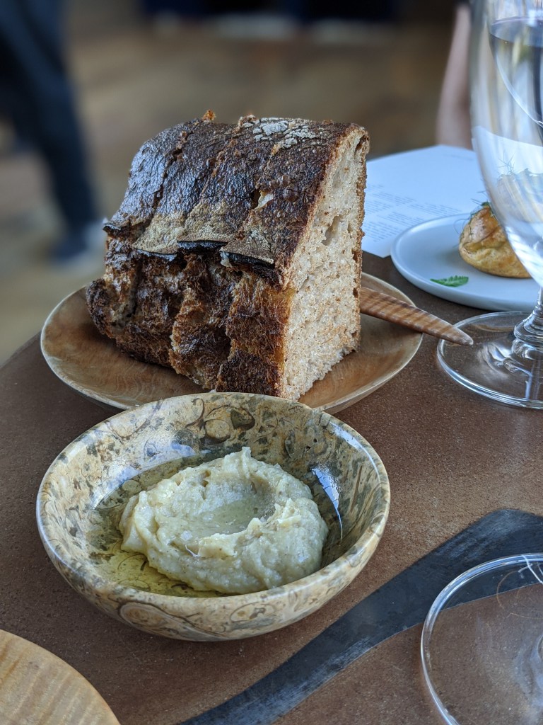 - Pain au levain : fait avec un mélange de seigle et de blé White Fife et Rouge de Bordeau. Servi avec de l’huile de tournesol pressée à froid et de la pomme de terre