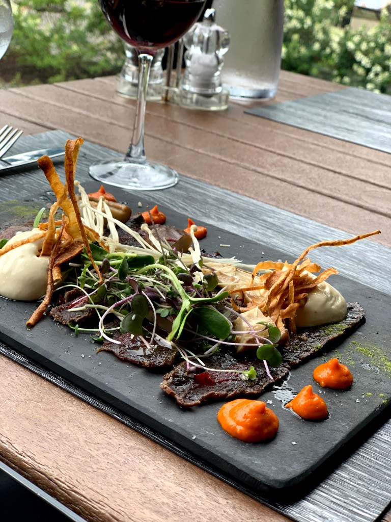 - CARPACCIO DE CERF DU QUÉBEC – Haut de ronde mariné au myrique baumier, fumé et laqué à l’érable et sapin de Gourmet Sauvage. Accompagné de mousse de cheddar vieilli à la bière Hop Rivet de la Forge du Malt, de pouding de poivrons rouges, de champignons marinés et garni de chip de panais, de verdurette et de champignons enoki.