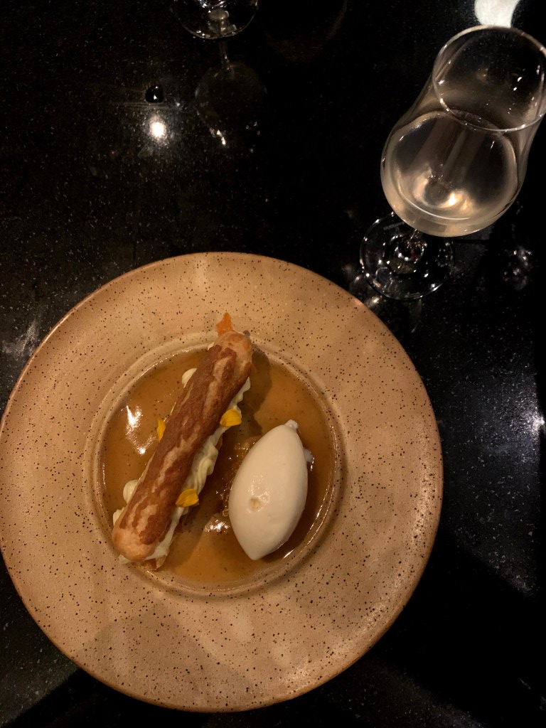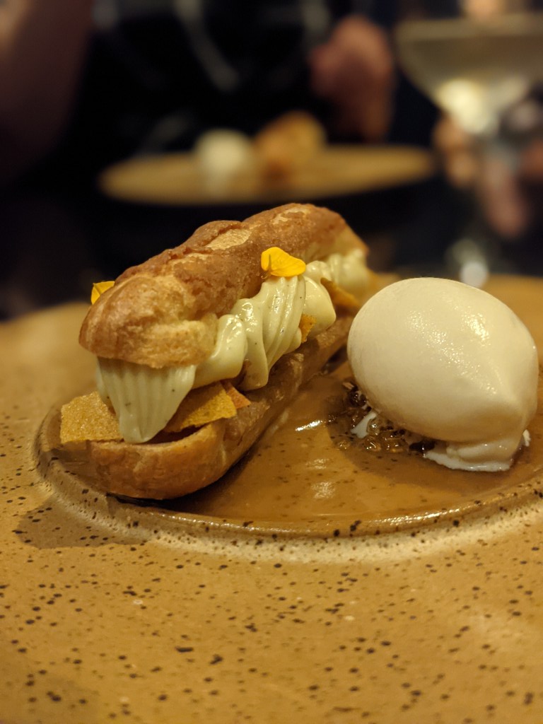Éclair de caramel au miel, poire pochée, tuile de miel et poire, crème tropézienne à la lavande et vanille, crème glacée au lait, poudre de pollen & hibiscus