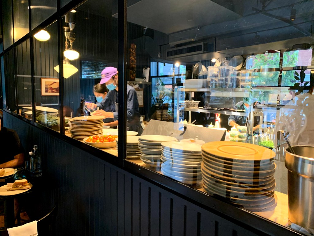 Ayant réservé dès l’annonce de la ré-réouverture des restaurants suite à la 3e vague COVID-19, j’attendais impatiemment le moment. Et l’attente en a valu la peine: la place qui m’attendait aux côtés de la cuisine est entièrement offrait une vue parfaite sur la brigade à l’oeuvre dans la cuisine.